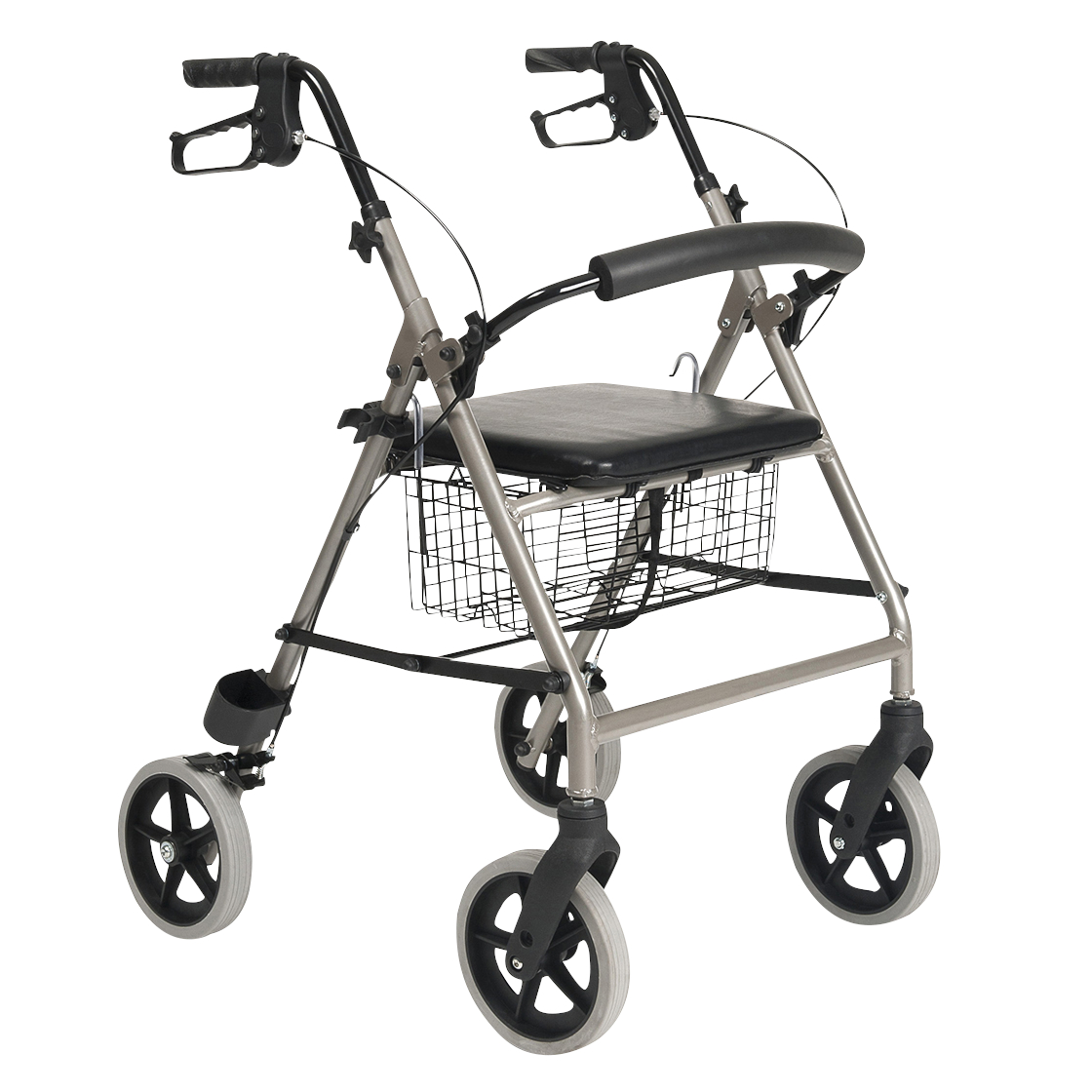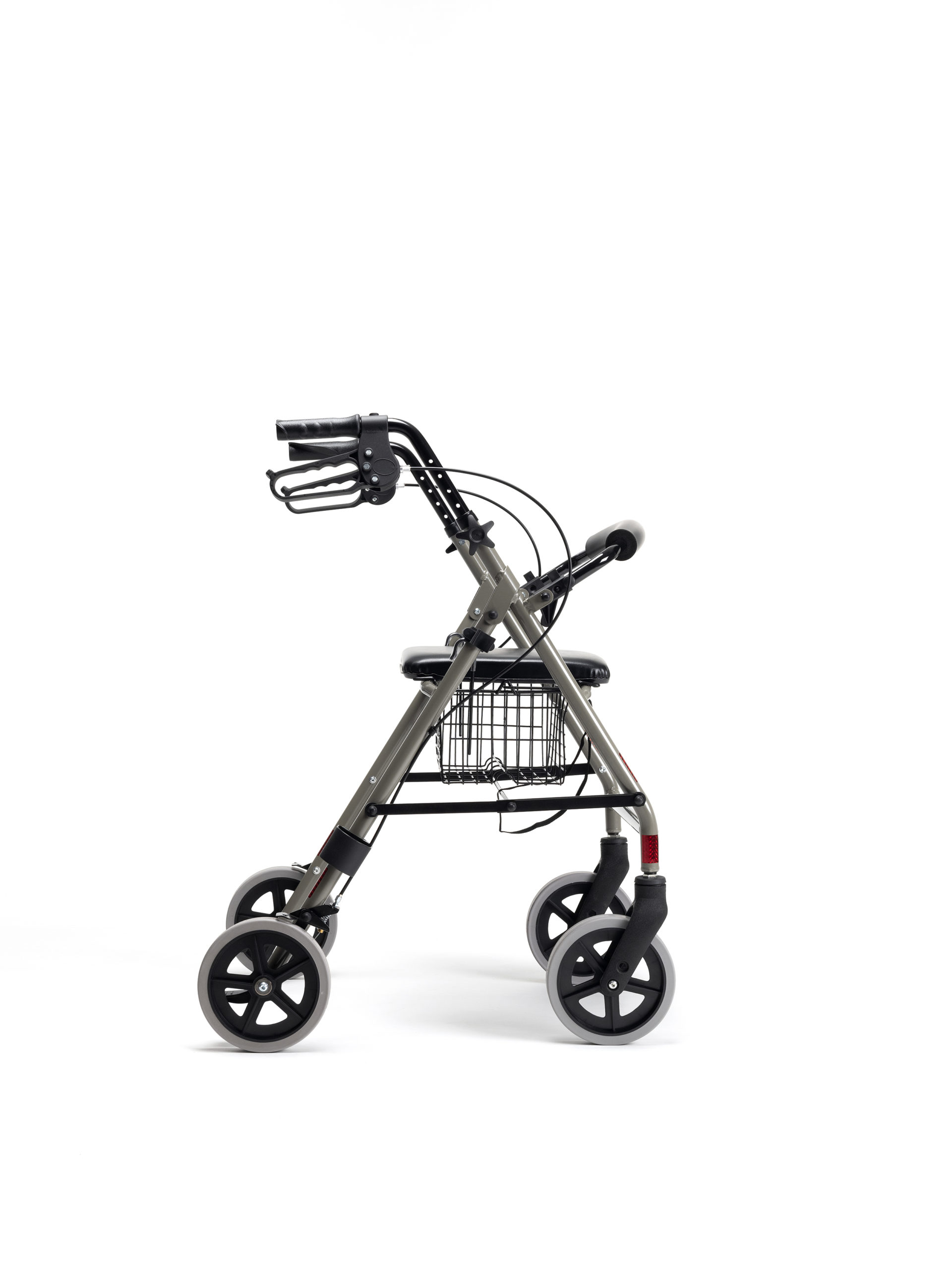 L’Eco-Light est un déambulateur pliable à 4 roues. Il est équipé d’un panier amovible, d’un siège rembourré et d’un porte-béquille. Une barre pliable offre un soutien supplémentaire en position assise. Equipé de freins de stationnement et de poignées réglables en hauteur. Pliable et prêt à être transporté en quelques secondes