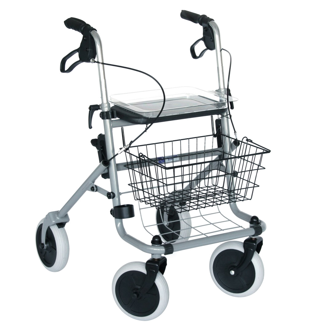 Déambulateur très robuste grâce à son châssis en acier, ses poignées réglables en hauteur et facilement pliable. Fourni avec : siège, plateau, panier et porte-cannes.