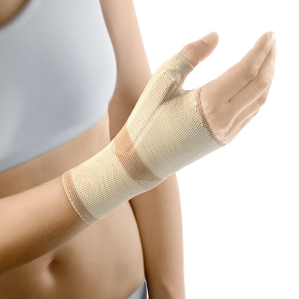 Bandage de main flexible pour soutenir l‘articulation métacarpo-phalangienne et en selle du pouce. Tricoté en forme anatomique, éléments de stabilisation supplémentaires au pouce.