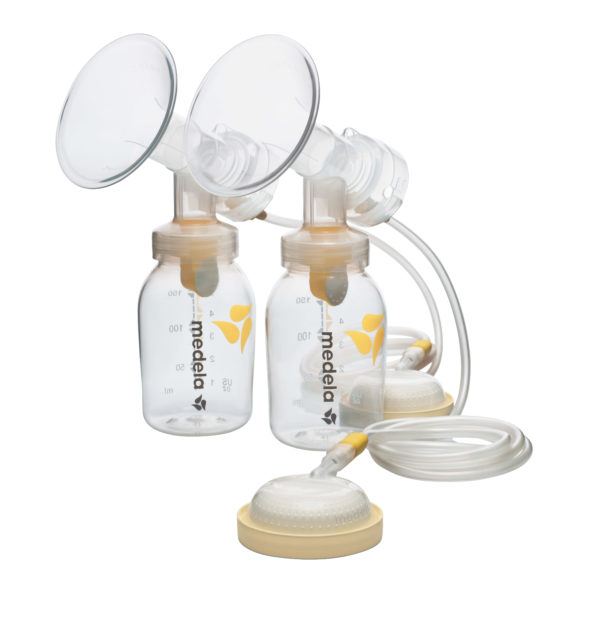 Contient : deux téterelles de 24 mm et deux biberons de 150 ml, deux couvercles et inserts, deux valves complètes avec membrane, deux capuchons pour membrane, deux membranes protectrices et deux tuyaux en silicone.